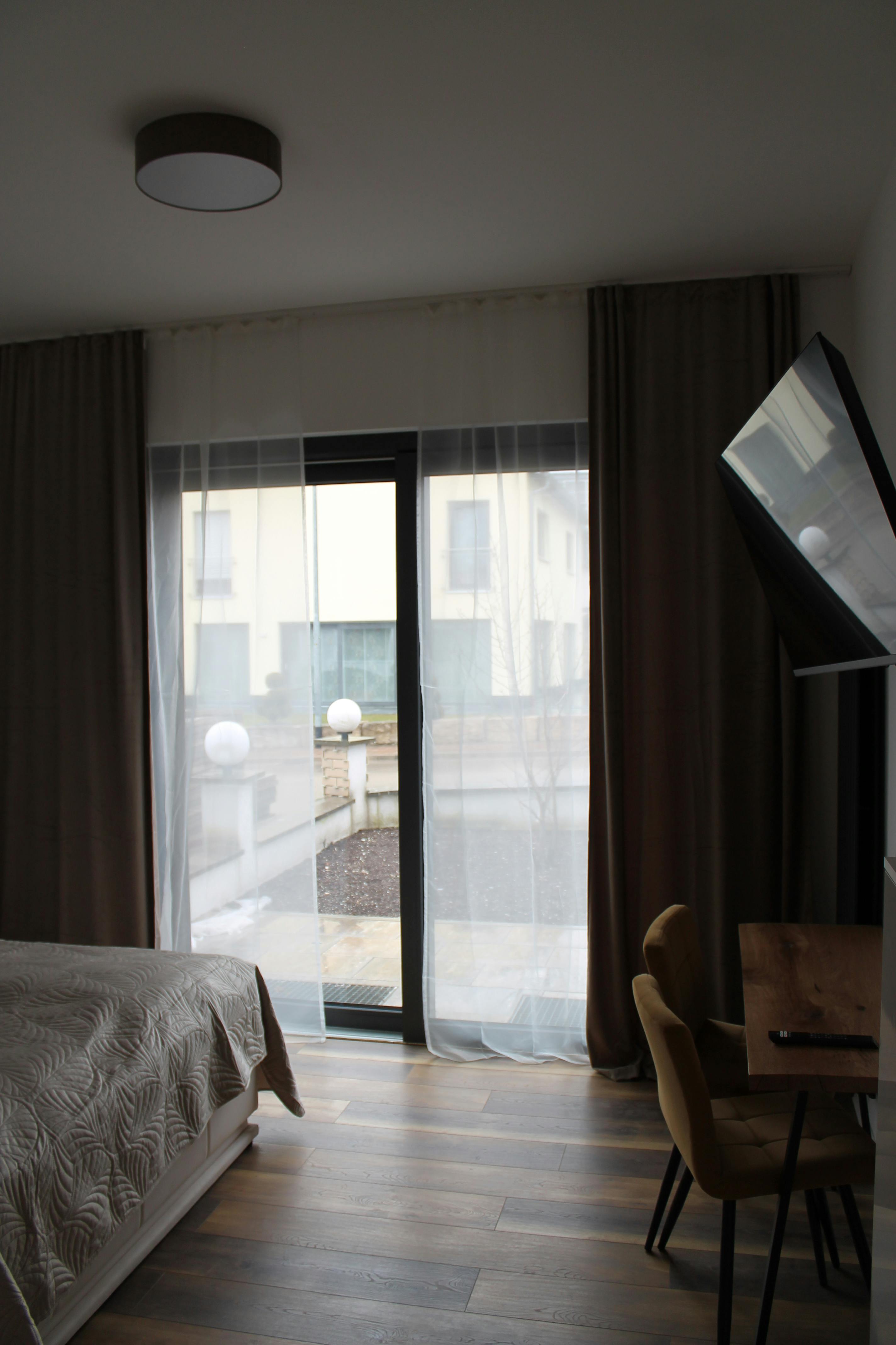 Das Doppelzimmer befindet sich im Erdgeschoss, der eigene Terrassenbereich ist ebenerdig begehbar. Dort finden Sie eine Sitzgelegenheit im Grünen mit kleinem Tisch. Das helle, moderne Zimmer ist mit Smart TV, Garderobenschrank, elektrischen Rollos und Schreibtisch ausgestattet. Das Badezimmer verfügt über eine Eck- Regendusche und kostenlose Hygieneartikel. Ein Fön ist vorhanden. Die Panorama Dachterrasse im ersten Obergeschoss können sie mit allen Annehmlichkeiten nutzen.